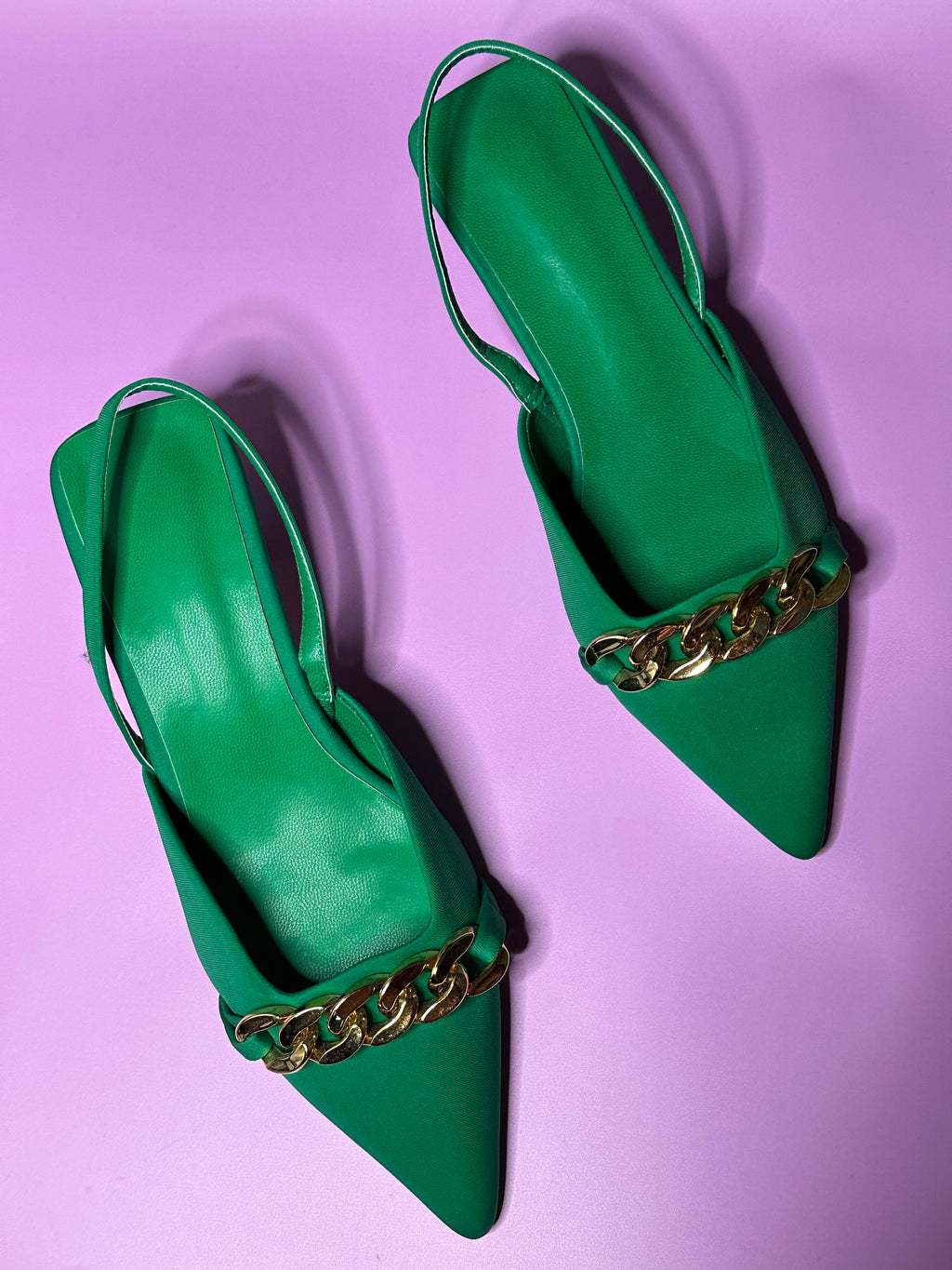 Transform your outfit with these bold and daring lime pointed toe slingbacks! The vibrant green color will mesmerize, while the elegant chain adds a touch of sophistication. These slingbacks are the perfect complement to any outfit, making them an exceptional choice for a bold and polished look that will not go unnoticed!